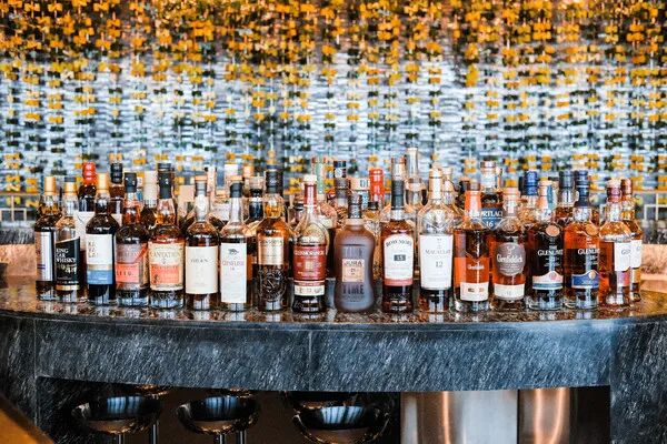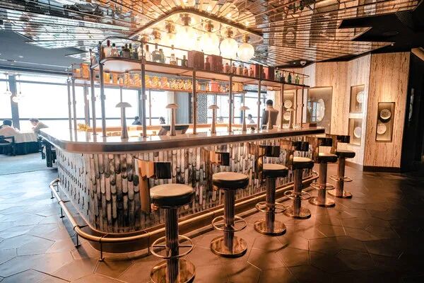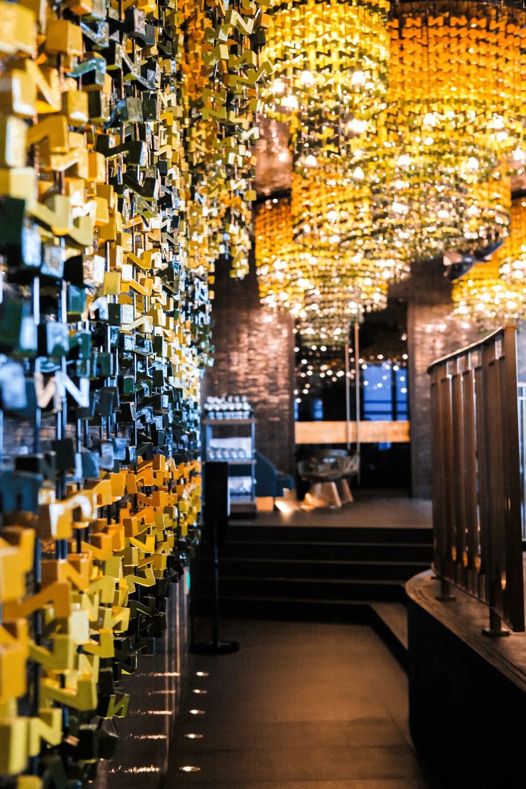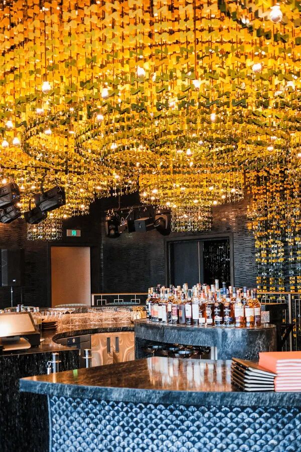59楼的露台屋顶酒吧开始躁动。酒吧到处悬挂这金色和绿色交错的装饰,灯光一打真的非常出片。