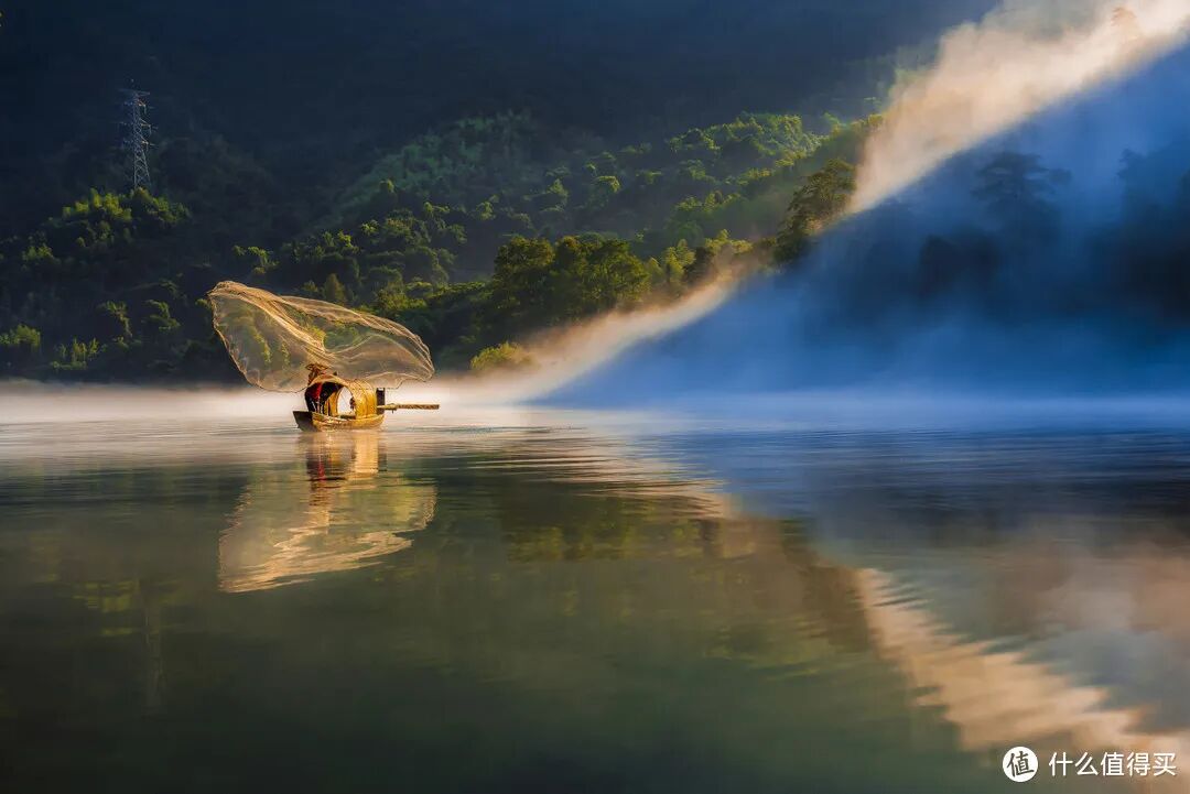东江湖位于郴州市区东南,是一个大型淡水湖泊。这里的湖水清澈见底,水域广阔,被誉为“南方明珠”。每年的4~10月,都可以在这里看到挂着红灯笼的渔船载着当地渔民在江上表演撒网。湖周围的山峰、悬崖、瀑布等自然景观十分壮观。