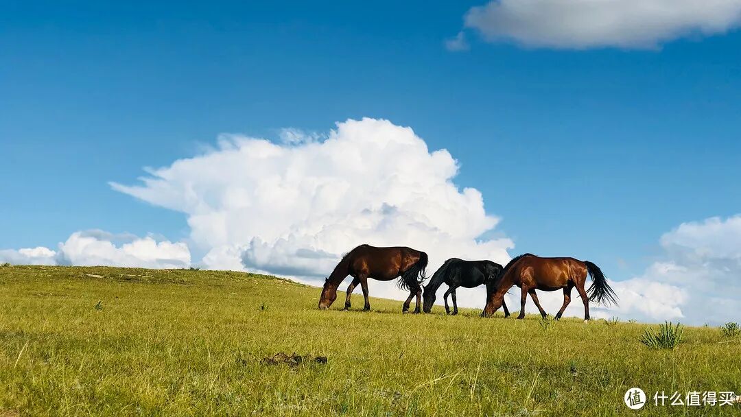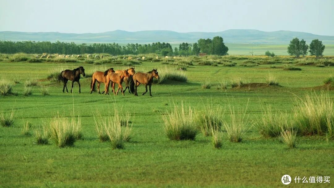 这里的草原给人以宁静和宽广的感受,仿佛远离尘嚣,与大自然融为一体。蜿蜒的河流静静流淌,骏马成群奔腾,在草原上自由驰骋,绒绒的草地一直延伸至大兴安岭的森林下。