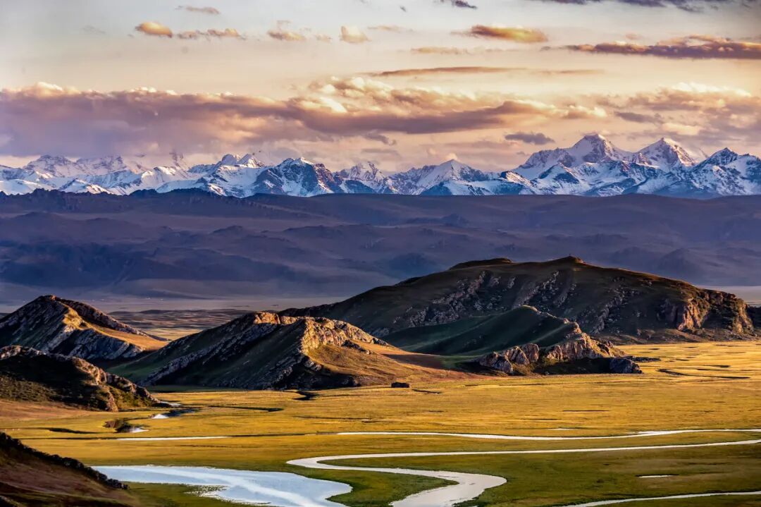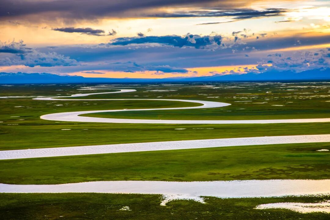 开都河在草原上蜿蜒曲折,勾勒出"九曲十八弯"的壮丽景象。它犹如母亲河般滋润着这片水草丰茂的土地。夕阳西下,此地声名远播,据说可以在湖泊的弯弯曲曲中同时瞥见九个太阳。这引发了一系列关于神话传说中后裔射日的故事在脑海中盘旋。晚霞如油彩般洒满湖面,就连绿草也柔和起来。