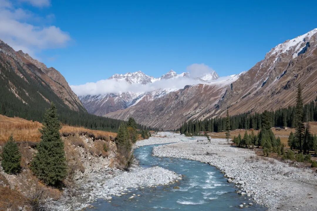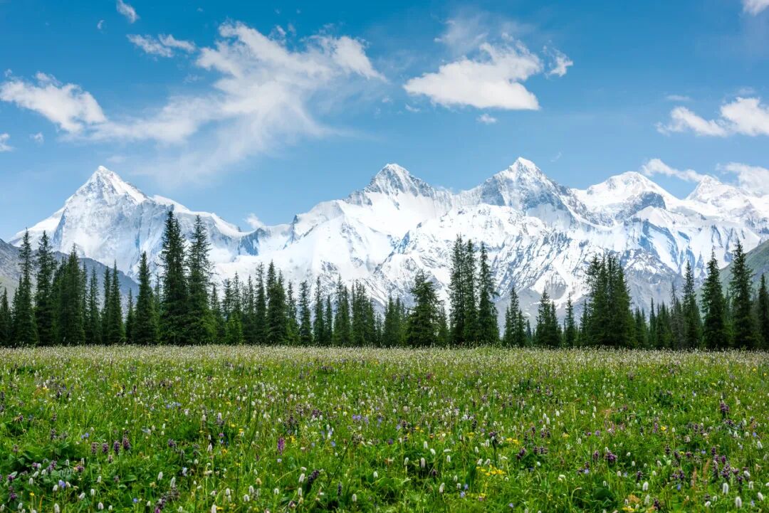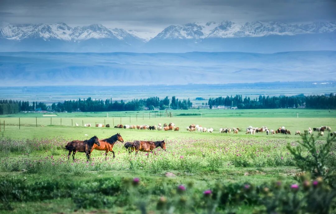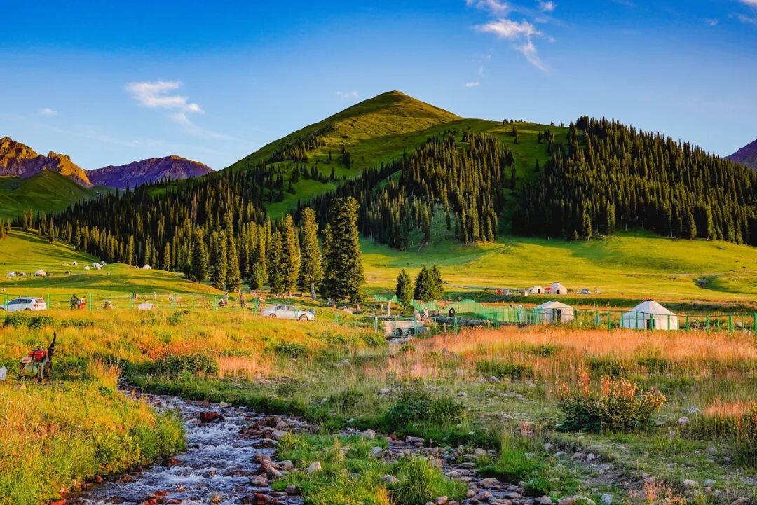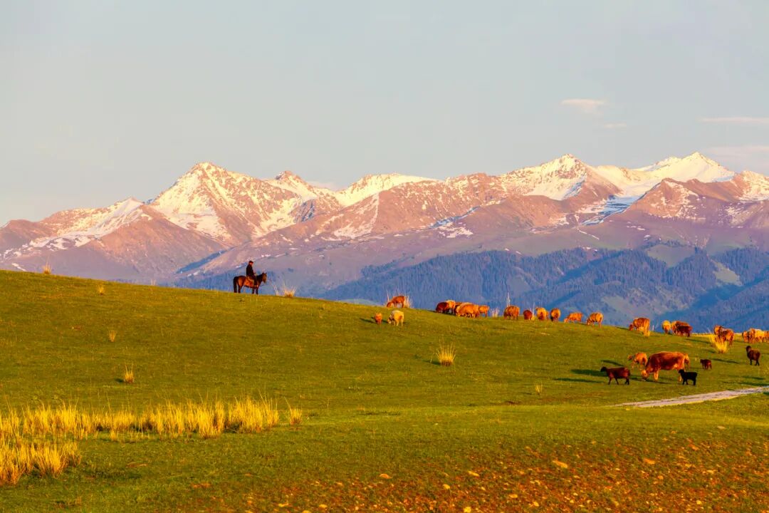 这条长达800公里的河谷就如一条绝世风景长廊,沿着天山蜿蜒而过,冰川河水滋润着郁郁葱葱的牧场,伊犁河在高山的怀抱中缓缓流淌。夏日里,这里一片翠绿鲜亮,鲜花遍布山谷。