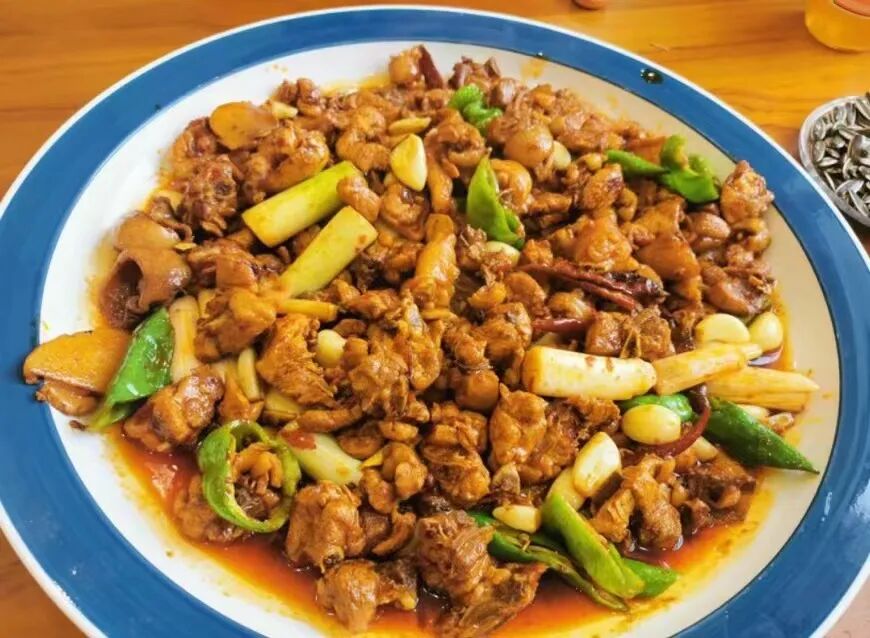一上桌,大盘子鲜香四溢,香气扑鼻。鸡肉嫩滑多汁,土豆绵软细腻,青椒爽脆微甜,红椒辣而不冲,所有食材在浓郁的酱汁中舞动。趁着热乎,一口咬下,滋味扑面而来,让人胃口大开。