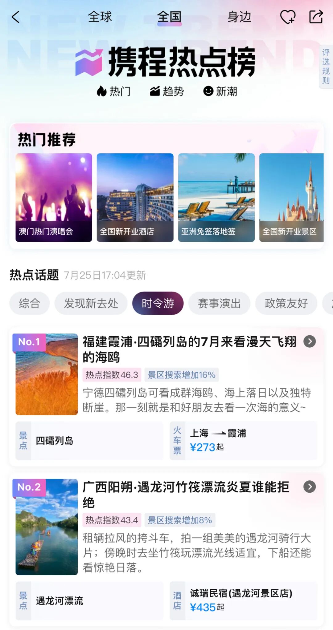 携程全新登场的「携程热点榜」,就可以实时查看近期哪儿好玩儿~更有赛事演出、旅游交通、政策免票/补贴等等资讯,让你不错过每一旅游信息差!
