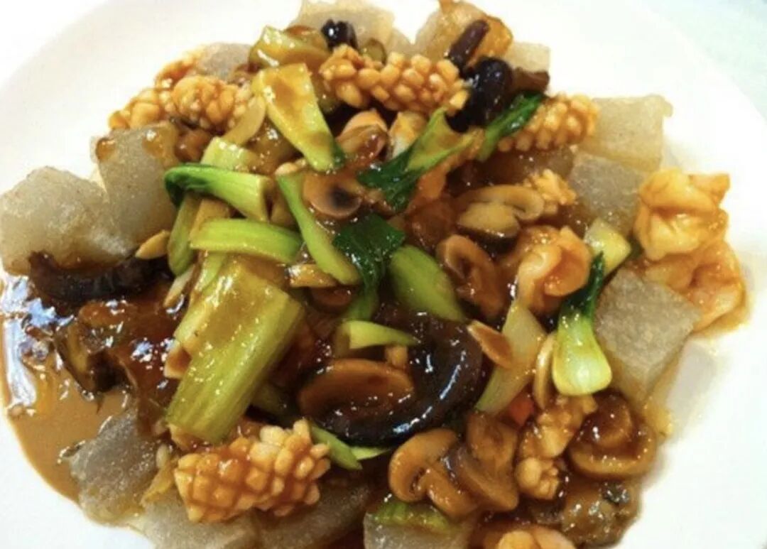 随后,加入海参、鲜虾等鲜美海产品一起炒制,再配以蒜末、生抽等调味料,最后出锅上桌。