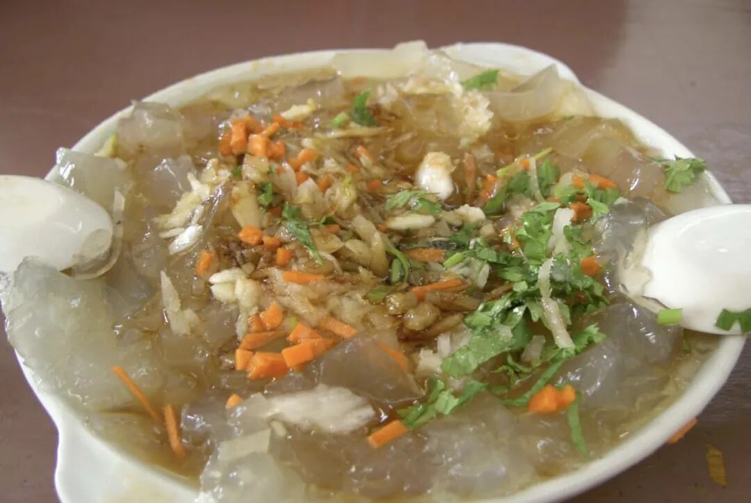 煮好后的水草会被过滤、冷却,然后切成细条,这就是海凉粉的主体了。海凉粉一般会搭配黄瓜,这样会增添清爽的口感。最后,再拌入一些调味料,特别是在夏季,海凉粉的上桌率非常高!