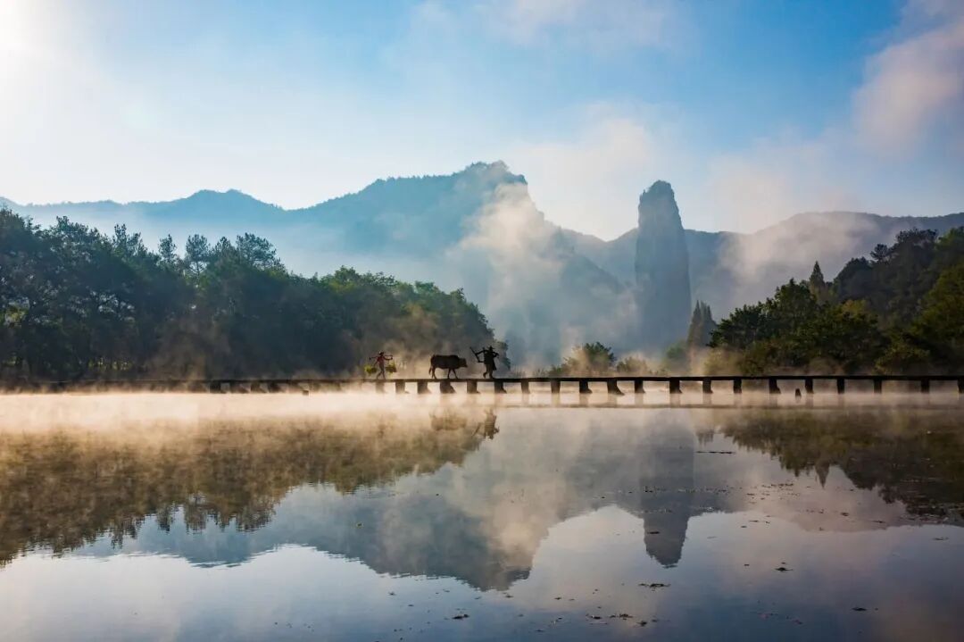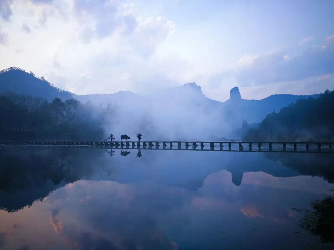 朱潭山的壮丽景色,特别是老人牵牛的照片所带来的火爆,似乎让人走进了一幅画卷。在天气晴好的时候,老人牵牛走过石桥,流水淙淙,云雾缭绕,定能创造出一幅如梦如幻的画面。
