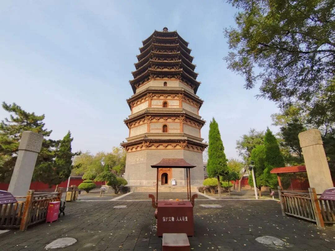 凌霄塔高约41米,是四座古塔中最大的一座,采用砖木混合结构,被誉为“木塔”。塔身的第四层中央竖立着一根直达塔顶的木质通天柱,这样的结构在国内独一无二,极为珍贵。从凌霄塔步行约十分钟,就能抵达正定最古老的寺庙——开元寺。