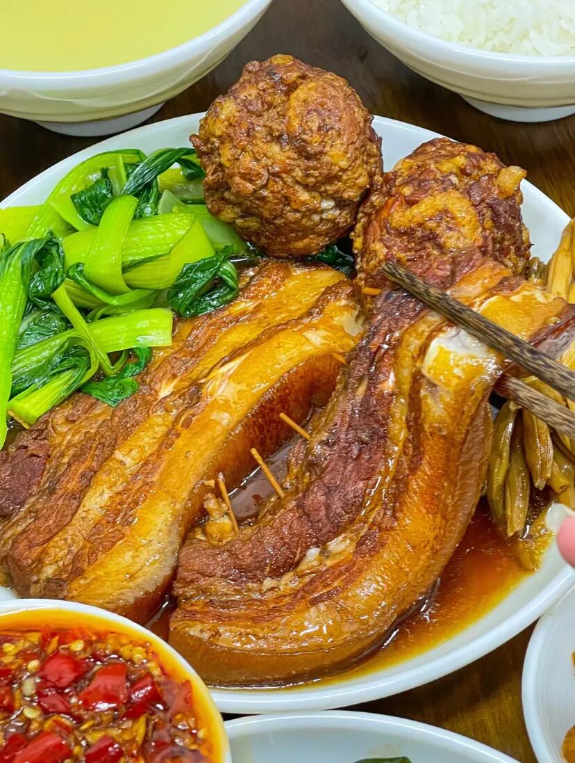 把子肉是徐州的特色美食,其独特之处在于肥瘦相间、咸香入味。将把子肉与米饭搭配,肉香与米香交织,每一口都是享受。在寒冷的秋冬,来一碗把子肉搭配素菜和热腾腾的米饭,让你温暖全身,疲劳烟消云散。