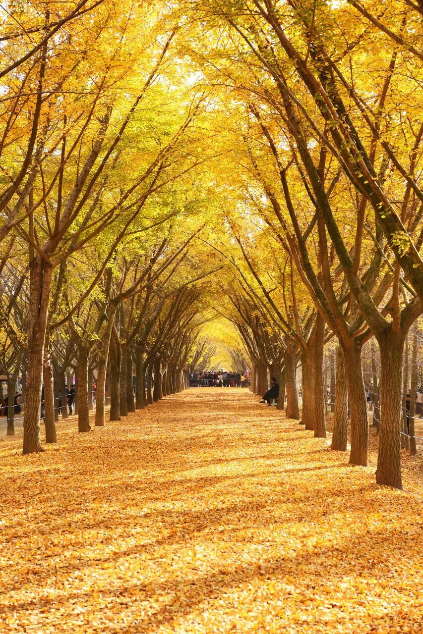 道路两旁的银杏树郁郁葱葱,而隧道内的银杏树在秋季绽放出耀眼的金黄,地上堆积着厚厚的落叶,宛如秋天的时光安静而美好。