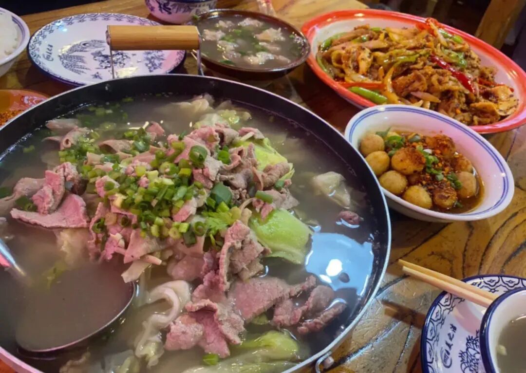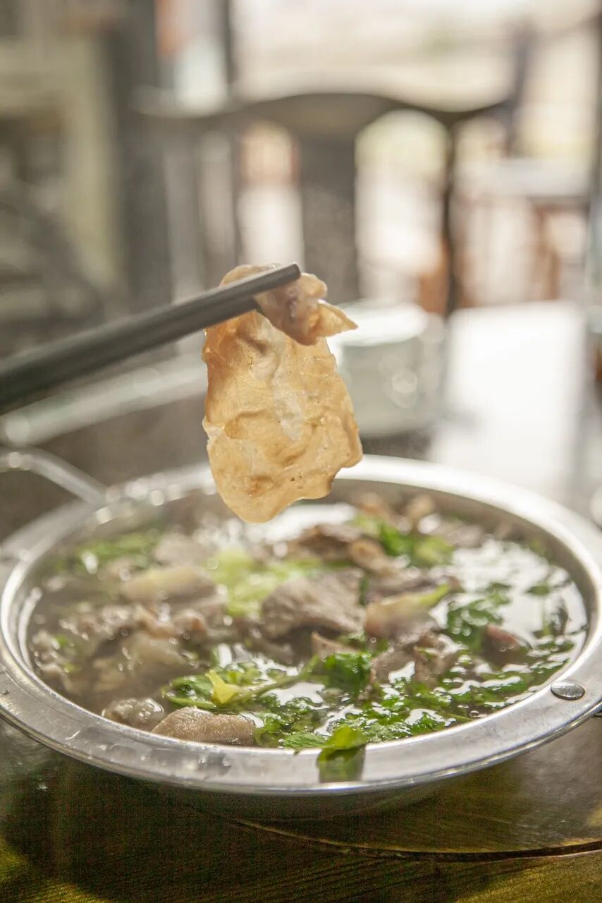 一碗醇香的大锅牛肉汤,内含着复杂而细致的香料,将各种美味食材与牛肉搭配煮制而成。这家名为跷脚牛肉店的火爆程度可谓非常高,甚至没有多余的座位供应。有些人站着享用,有些人蹲下来品尝,还有一些人直接坐在门口的石阶上,双腿交叉地端起碗来吃。