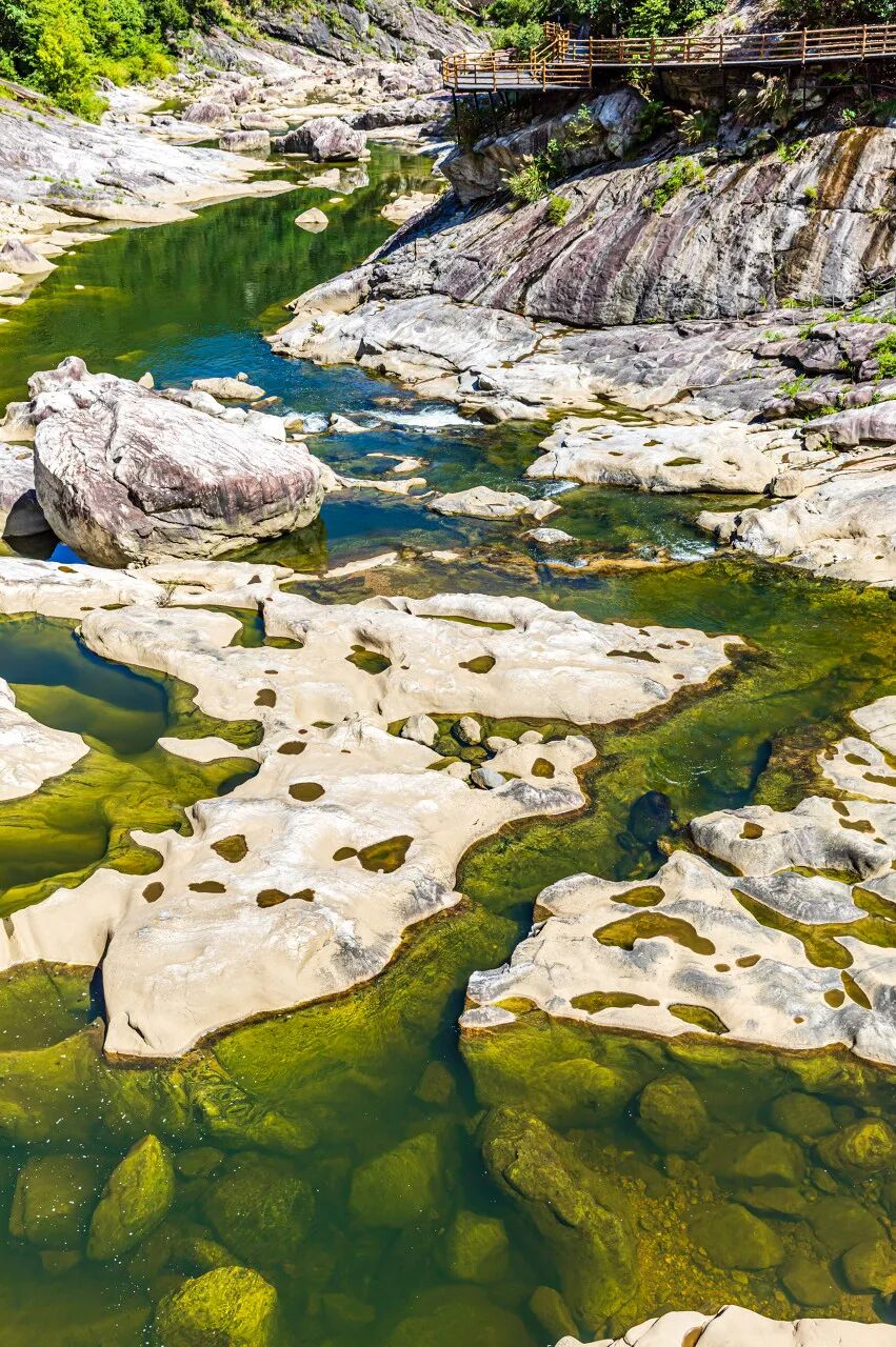 翡翠谷位于黄山附近,是一处小众景点,被誉为"黄山的小九寨"。坐上缆车进入谷中,你将发现水质清澈的琉璃水,碧绿的溪流在脚边流淌,清澈的溪水倒映着周围的景色,宛如仙境一般。溪边的瀑布也时不时流泻,增添了一份宁静和美丽。