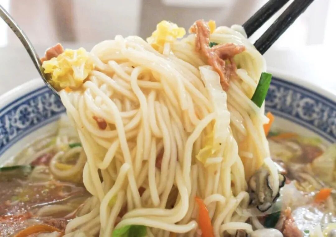 这口味道只能在莆田吃到,这碗面的独特之处在于高汤底,但它的独特之处在于海鲜配料,牡蛎、蛏子、甜虾、五花肉、红菇,这些都融入了这碗面中,使得每一口都散发着浓郁的海鲜风味。