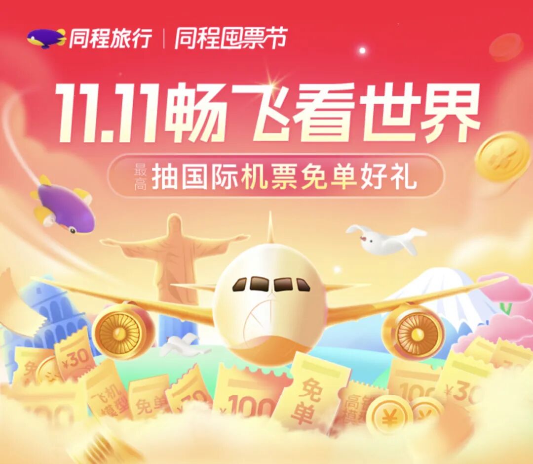 即日起-11月11日,在国际机票专场可参与抽奖,有机会获得机票券、同程高铁模型、同程旅行机模以及最高的机票免单奖项!