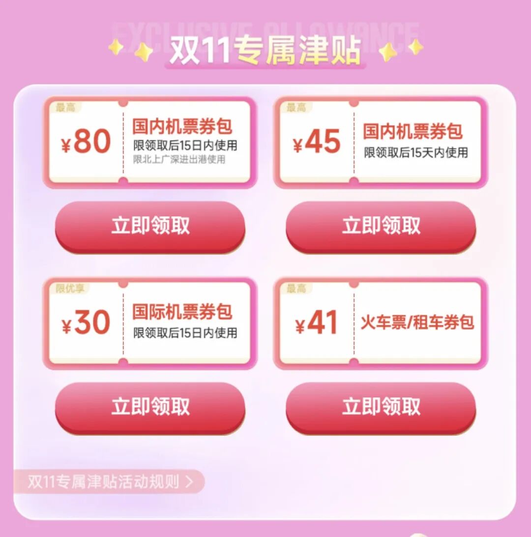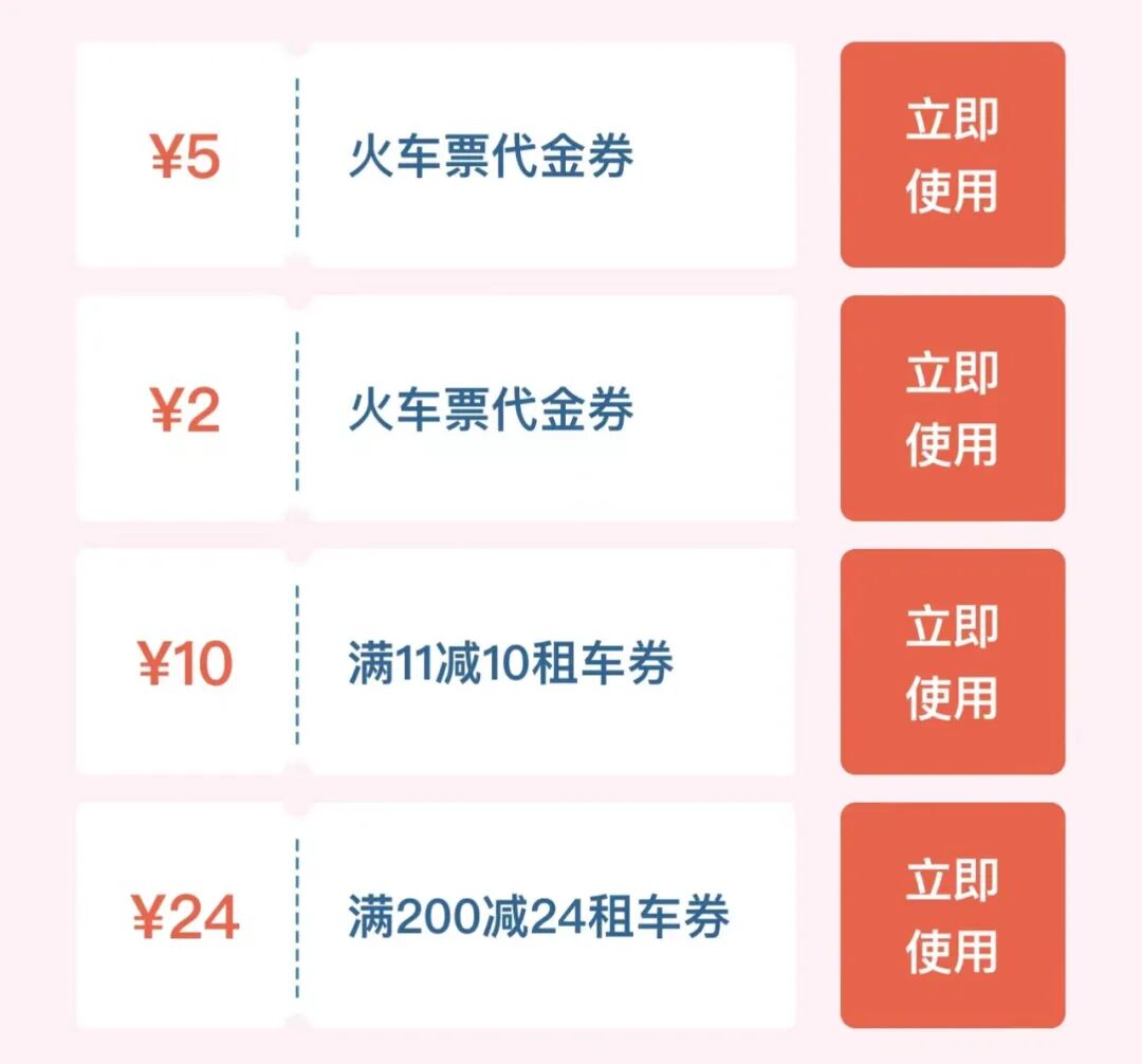 大额机票满减券、火车票优惠、租车券包