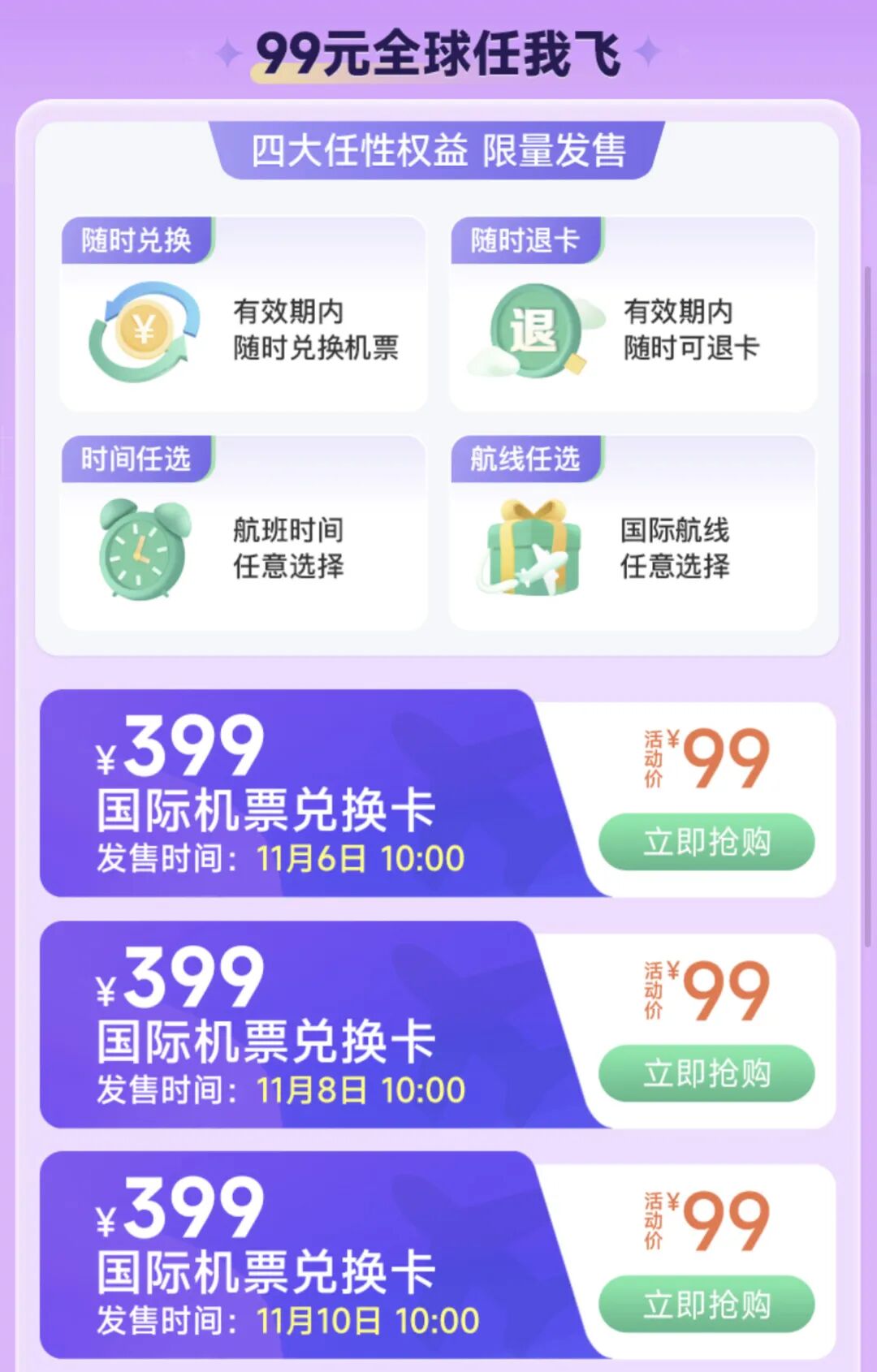 11月6日、8日、10日的每天早上10点,99元开抢价值399元的国际机票兑换卡!