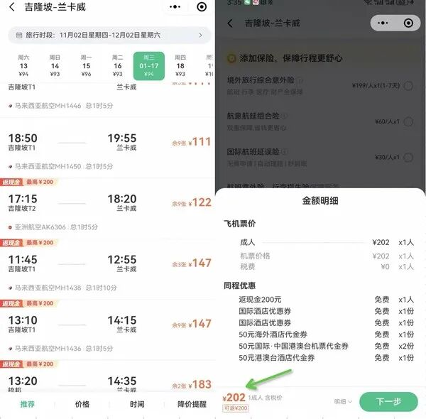 国际航线也有很多支持返现,比如以下这条吉隆坡-至兰卡威,返现后只要2块钱: