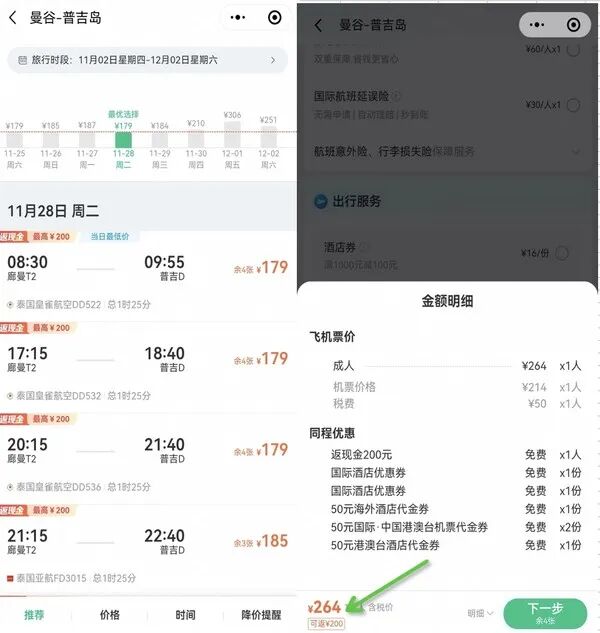曼谷到普吉岛,返现后64元: