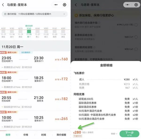 再次划重点,一定要把往返机票拆开买,这样就可以一次性把2张100元券都用掉!另外,行李额度单程+40元,就可以有托运40kg了。