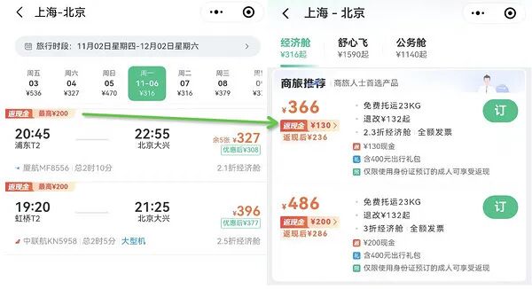 举个例子:上海-北京,返现后单程机票一张只有200多起: