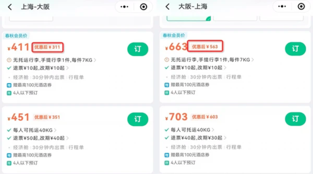 我们也帮大家实测了一下,以11-12月春秋上海往返大阪为例,去程券后311元/人,回程券后563元/人起,总计往返含税874元/人起!