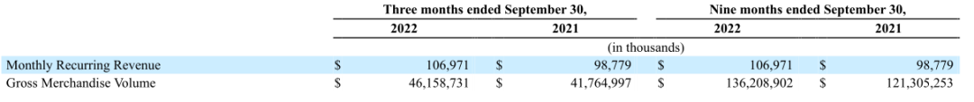 在Shopify2022年第三季度财报中,衡量和预测Shopify业务发展的两个重要指标显示,月经常性收入(Monthly Recurring Revenue)为1.07亿美元,同比2021年增长8.3%。前九个月GMV总计1362亿美元,第三季度GMV462亿美元,同比2021年Q3增长10.5%。