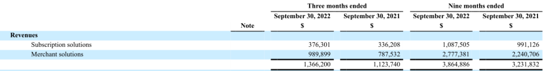 Shopify第三季度总营收为14亿美元,同比增长22%。其中,订阅解决方案同比增长12%;商家解决方案同比增长25.7%,占总收入的75%。