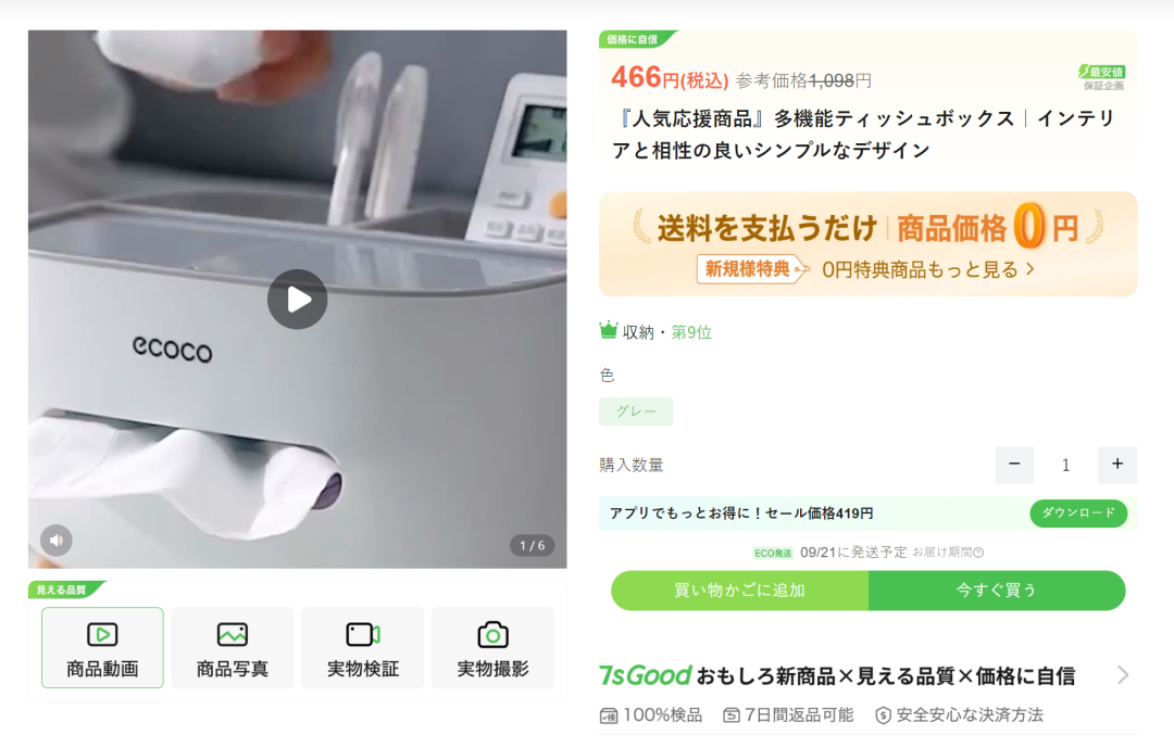 7sGood采用业界首创的“实物检验后交货”模式,商品分为库存商品和预购商品。库存商品可以在订单确认后24小时内发货,而预购商品属于“环保行为”,当7sGood收到订单时,会从工厂采购并在检查后将产品运送给客户,下单后大约需要14到17天才能发货。