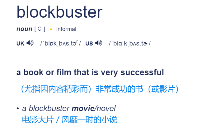 在这里,外刊称其为 blockbuster ,根据剑桥词典的解释,我们可以把它理解成大片,轰动。