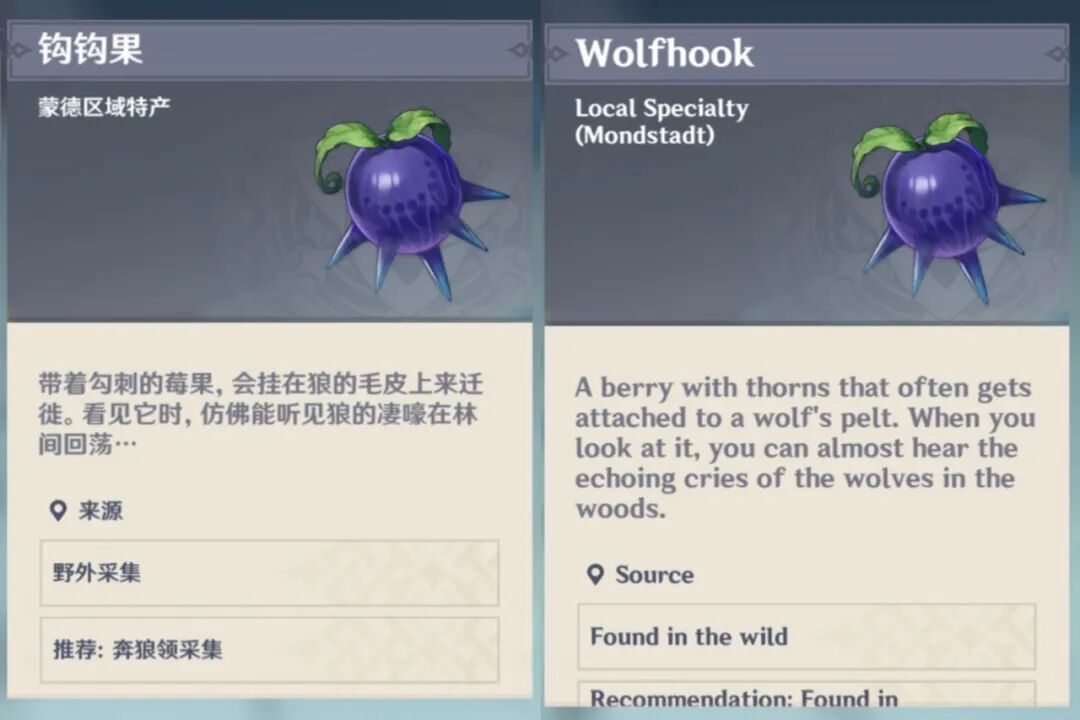钩钩果的英文翻译可以说是“意料之外,情理之中”了。Wolf 是“狼”, hook 是“钩”,Wolfhook 直译就是“狼钩”,也是很符合钩钩果“带勾刺”、“会挂在狼的毛皮上迁徙”的特点了,不过还是“钩钩果”这个名字更可爱捏。