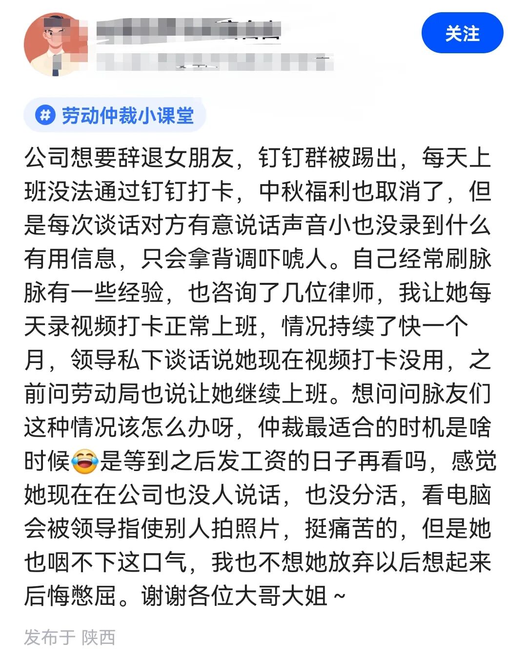 前段时间,快到中秋国庆节的时候,有位网友发帖称:“公司想要辞退女朋友,钉钉群被踢出,每天上班没法通过钉钉打卡,中秋福利也取消了,但是每次谈话对方有意说话声音小没录到什么有用信息,只会拿背调吓唬人.....,感觉她现在在公司也没人说话,也没分活,挺痛苦的,但是她咽不下这口气,我也不想她放弃以后想起来后悔憋屈。”