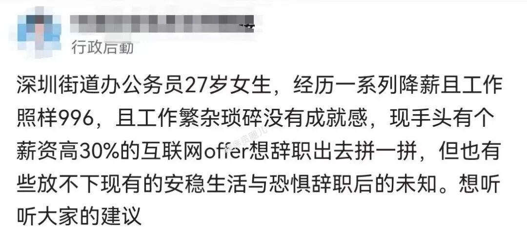 最近,一位某深圳街道的女公务员发文称:“27岁,经历一系列降薪且工作照样996,工作繁杂琐碎没有成就感,手头有个薪资涨幅30%的互联网offer,想辞职出去拼一拼,但有些放不下现有的安稳生活与恐惧辞职后的未知。”