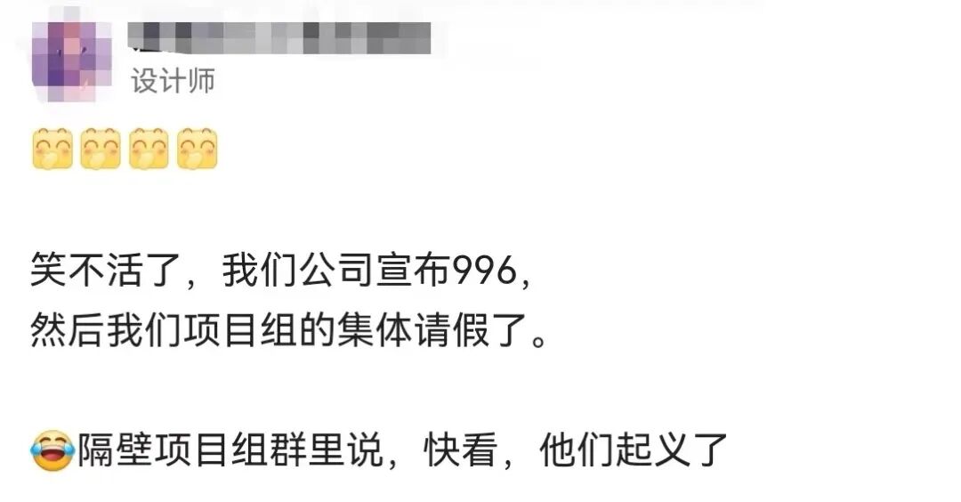 最近某互联网公司的一位员工称,他们公司宣布996了,然后,他们项目组的员工在并没有约好的情况下,全部集体请假抗议。甚至隔壁项目组在群里面说:“快看,他们起义了。”