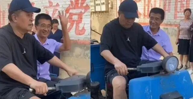 视频中他挑起扁担时显得有些艰难,他甚至在看起来有些破旧的村庄中驾驶三轮车。尽管他的笑容有些无牙且滑稽,但他的苍老面容让人感到有些唏嘘。