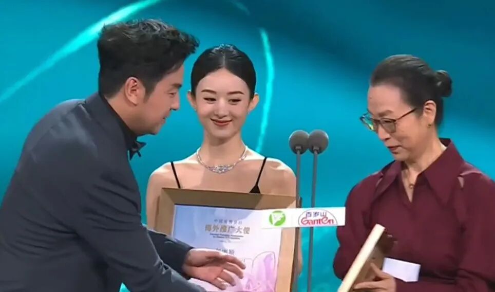 在一个环节中,赵丽颖和雷佳晶共同上台,著名表演艺术家为两人颁发了中国电视节目海外推广大使的荣誉身份。