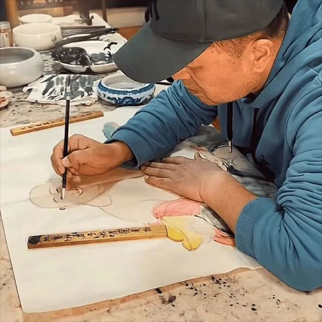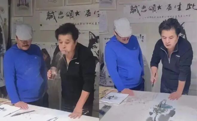 他曾经在张汉忠的面前画了一束荷花,并向画作喷水,画作名为“雨荷”。