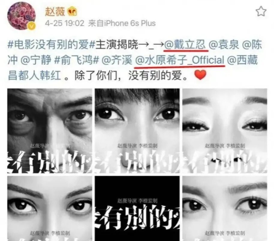 2016年,赵薇在社交平台上宣布了电影《没有别的爱》的参演演员名单。