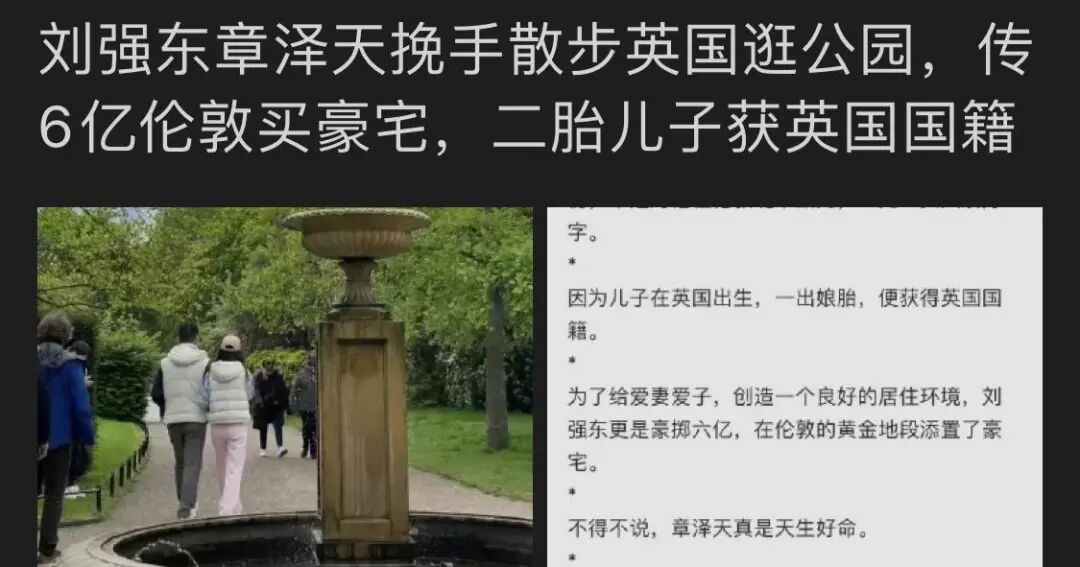 有知情者透露,章泽天和刘强东在伦敦已购置了6亿豪宅,他们两个月大的二胎宝宝已取得英国国籍。