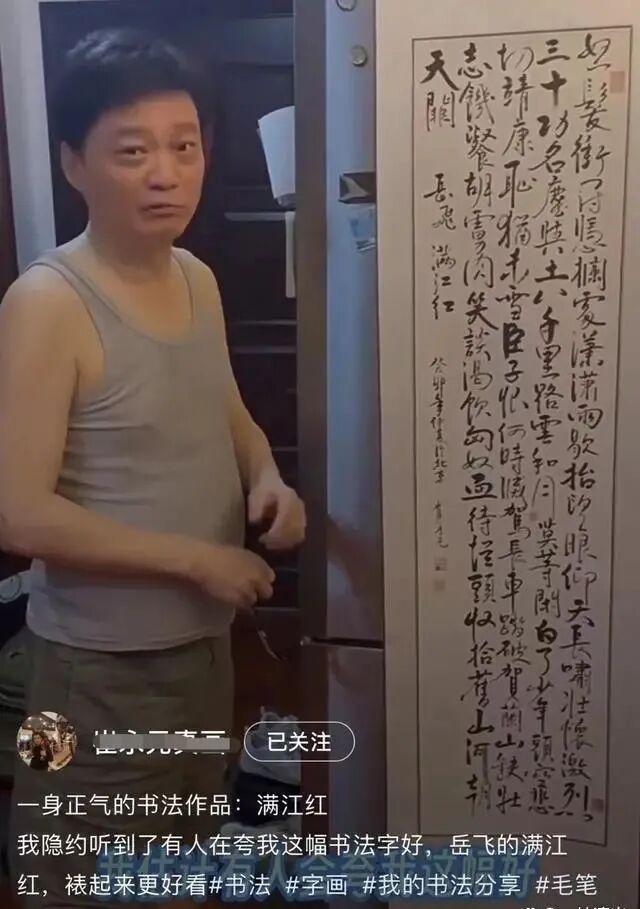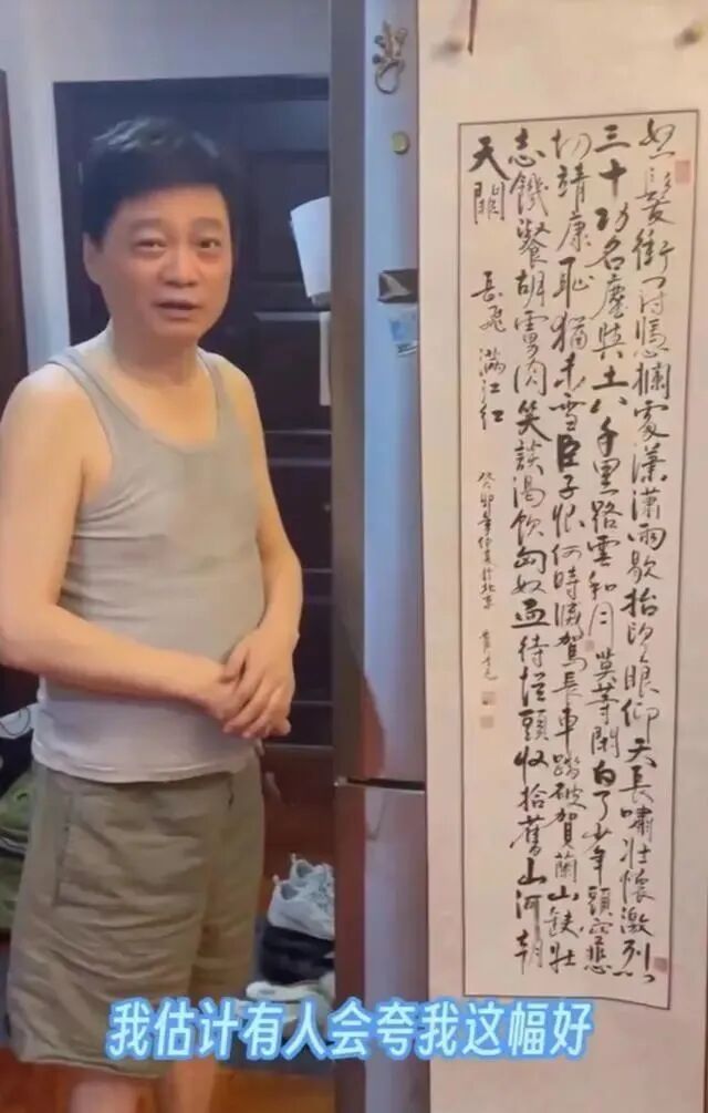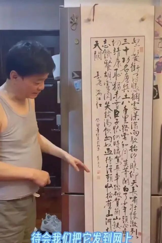 他兴奋地向粉丝展示并讲解自己的书法作品,自信地说:“我觉得有人正欣赏着我的作品,他们说裱好后效果会更加出众。”