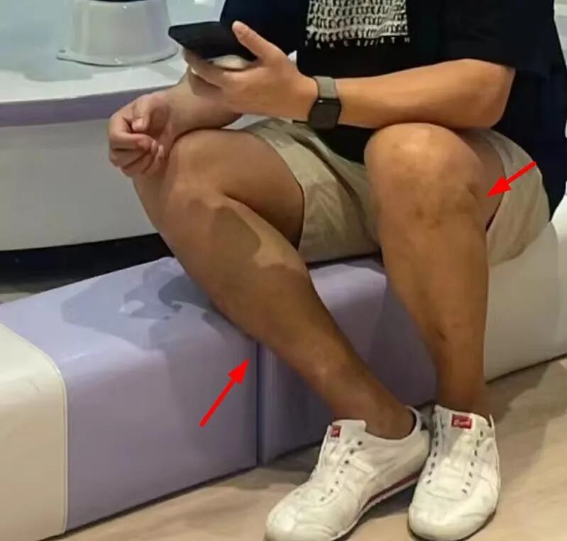 而值得注意的是,王学兵的腿上布满了伤疤和淤青,与他手上相对光洁的皮肤形成了鲜明的对比,令人颇感疑惑。