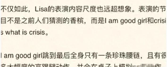 那么,Lisa为我们带来了怎样的演出呢?据悉,Lisa在舞台上演绎了一个关于白领职场生涯的英文舞蹈。随着音乐的节奏,她的服饰逐渐减少,最后只剩下由珍珠制作的裤链。