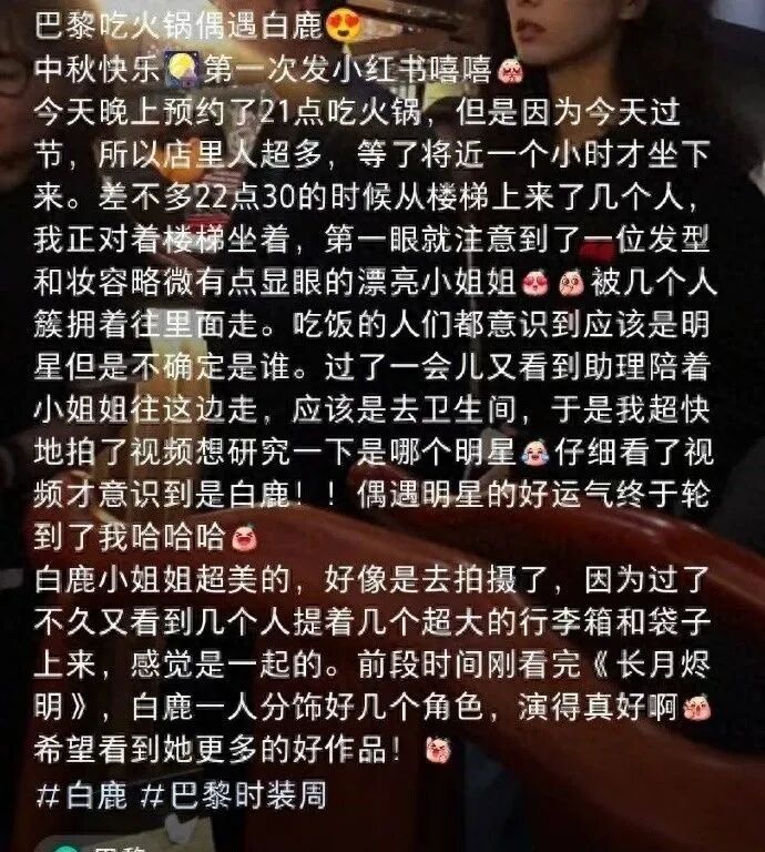 事实上,白鹿去了巴黎时装周,但并没有观看疯马秀,而是去吃了火锅,并被网友偶遇。网友还晒出了与白鹿的偶遇照片。
