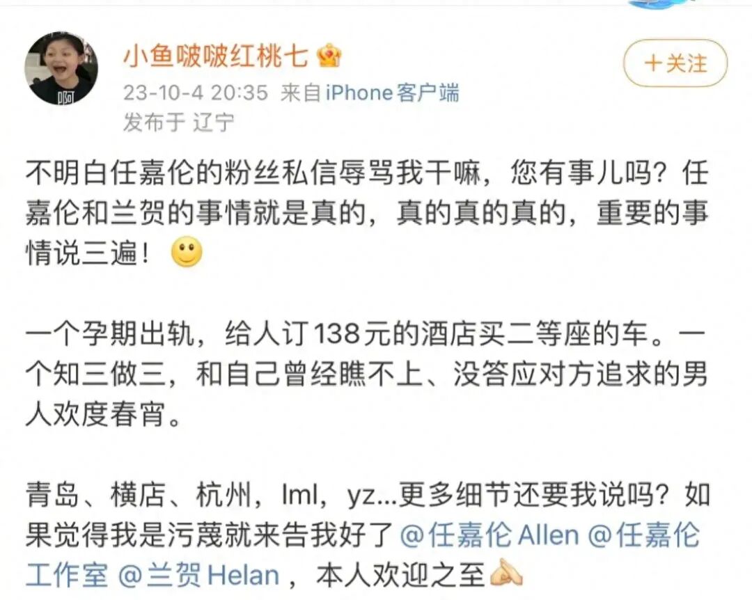就在10月4日,一位网友,化名为“小鱼啵啵红桃七”,因为遭到了任嘉伦粉丝的私信侮辱,公开披露了一些关于任嘉伦和兰贺的信息。