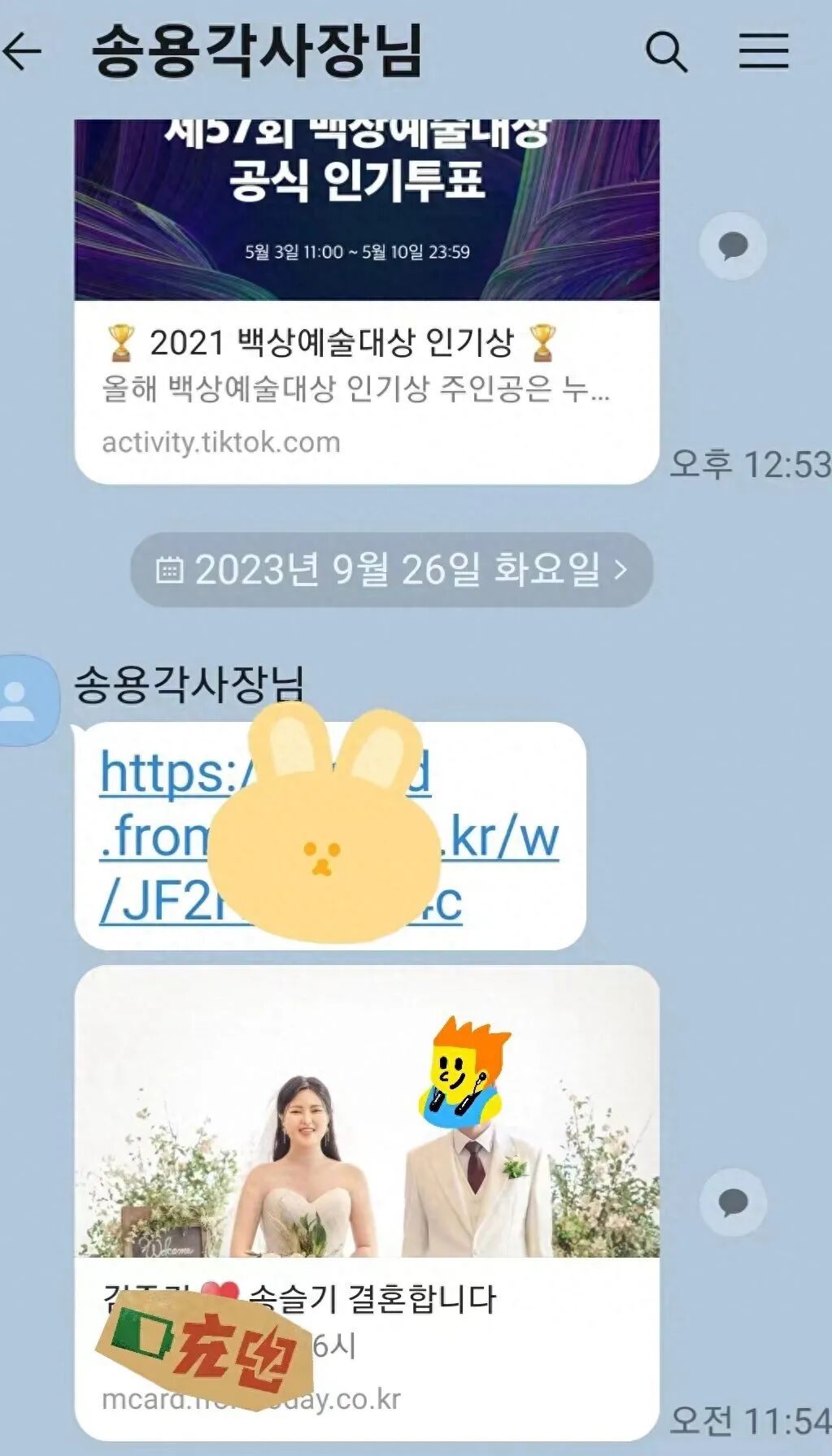 邀请函中曝光了宋仲基妹妹与新郎的合影,由于新郎是素人,网友们还为他打上了马赛克。