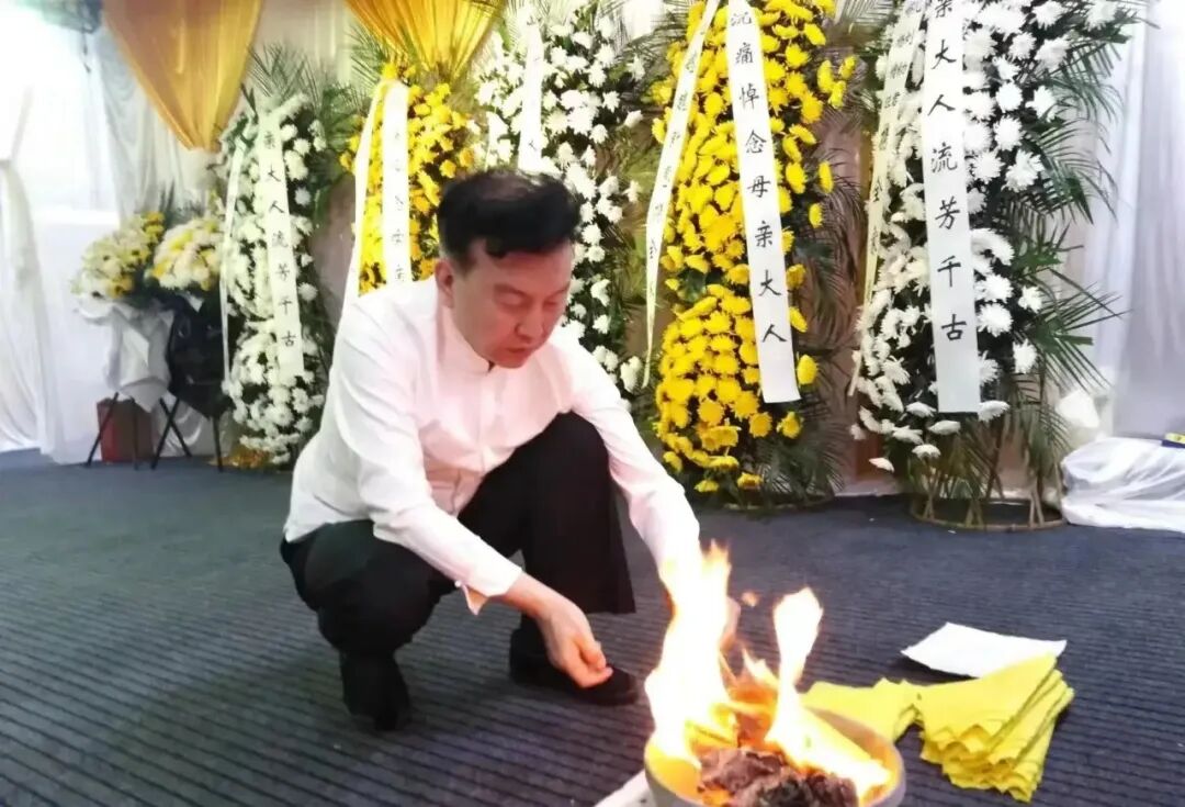 从照片上看,兄弟可是花了心思啊,鲜花鋪成一条路,桌上摆满了送行的贡品。身穿白衣黑裤的大哥蹲在地上,一张黄纸接一张地投入火盆,场面颇为庄重。