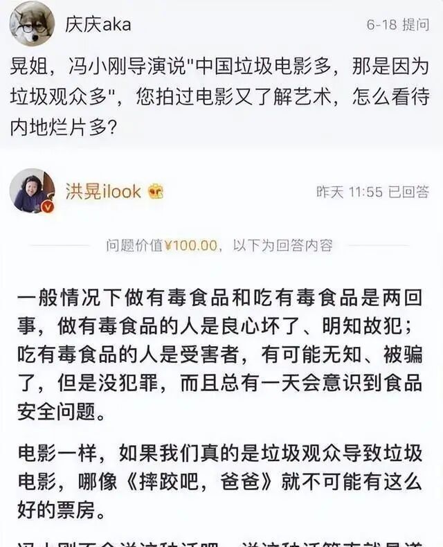洪晃对冯小刚的言论作出了愤怒回应,他明确指出做有毒食品和吃有毒食品是完全不同的两个问题。而冯小刚声称中国没有好电影时,也遭到了洪晃的直接抨击。