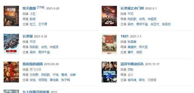 甚至在电影中的出演,也主要是一些如《长津湖》《我和我的祖国》《1921》等红色电影。
