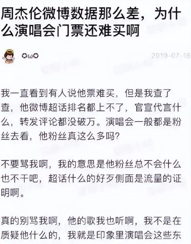 2019年7月16日,一篇名为“周杰伦微博的低迷数据,为何演唱会门票如此难买”的帖子引起了网友的关注。有一天,一群周杰伦的拥趸回应称:你说他钟爱奶茶。