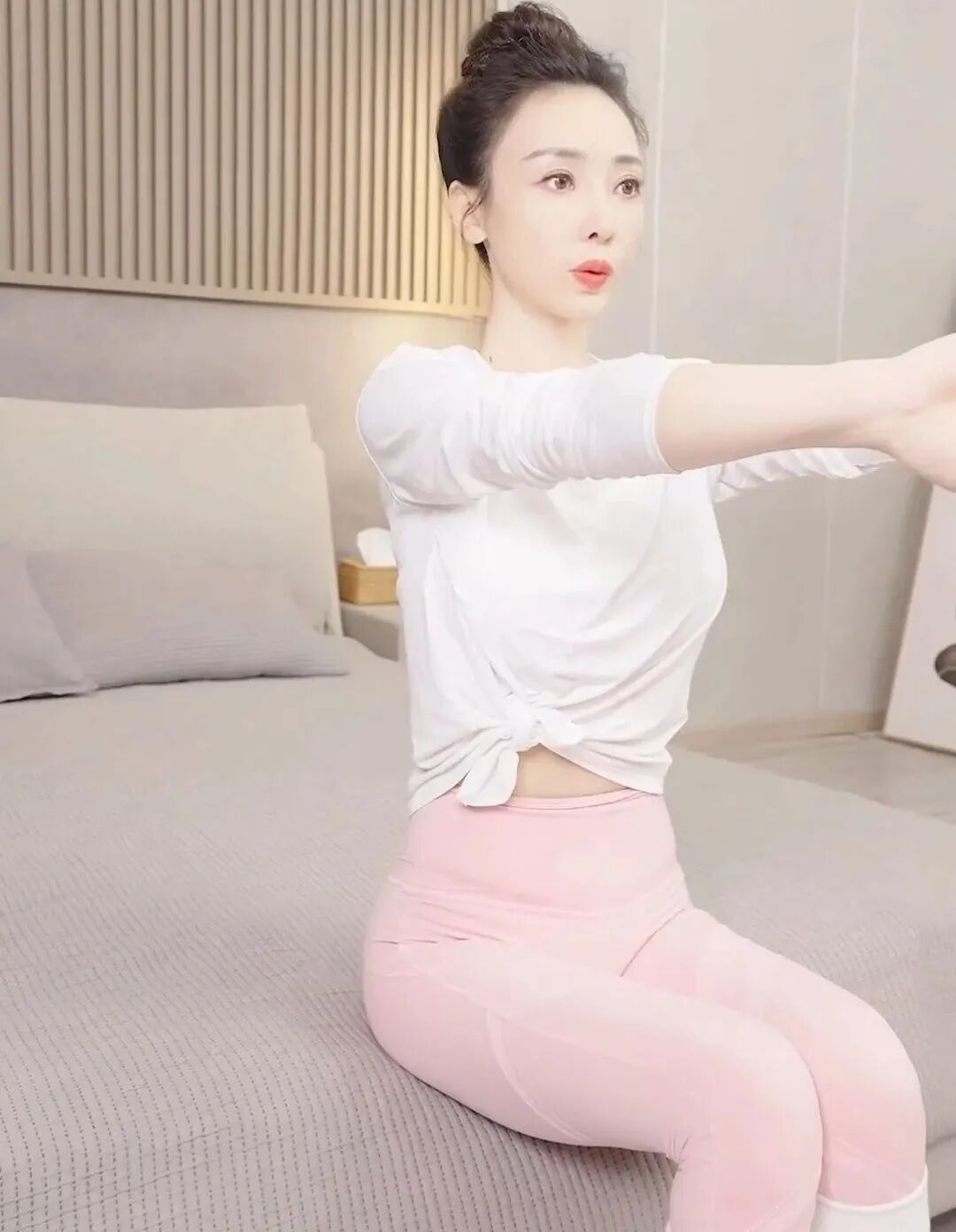 柳岩身穿白色的瑜伽装,搭配粉色的高腰紧身裤,展现出她性感的身材曲线,显得非常柔和。她身上每一寸肌肤都显得如此白皙细腻,整个人的状态极佳,一看就知道并非是个43岁的女人。