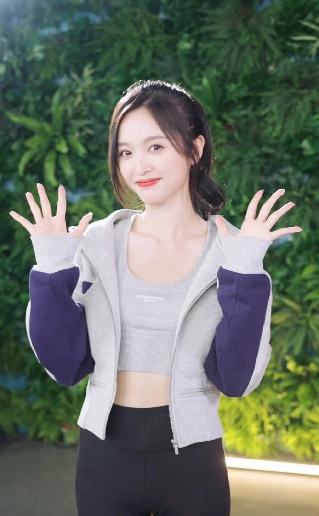 吴宣仪身穿灰色的瑜伽装,配以黑色的高腰紧身裤,脸上充满了胶原蛋白,展现出性感的腰身,双手向前方张开,脸上洋溢着可爱而迷人的笑容,简直让人感到舒适又疗愈。吴宣仪的身材纤细灵动,形象甜美酷炫,看起来美丽动人。