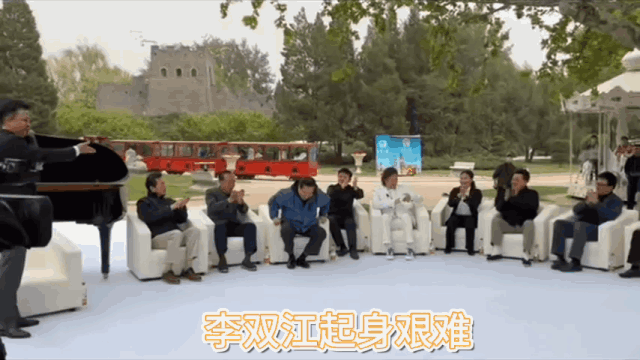 从画面中可以清楚看出,李双江已经身体佝偻了很多,站起来时非常吃力,走几步都显得摇摇晃晃。